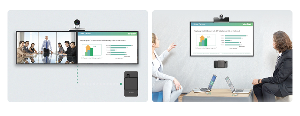 MVC系列产品采用亿联智能消噪专利技术,智能消除键盘、鼠标敲击声等非语音,避免杂音干扰,沟通更专注。同时,91°大视角UVC50摄像机与12倍光学变焦UVC80摄像机,适用于不同会议室类型,致力于还原最真实会议场景,给用户带来最佳会议体验。